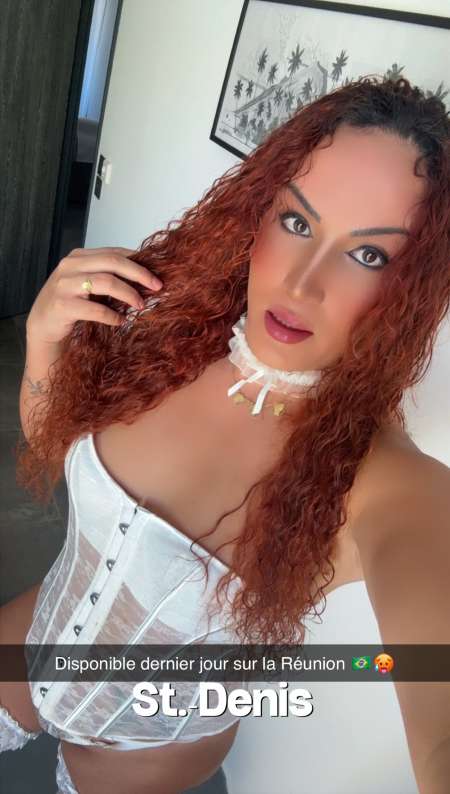 Je suis une escorttee femme transexuelle Aryela brésilienne avec les cheveux roux bouclés.