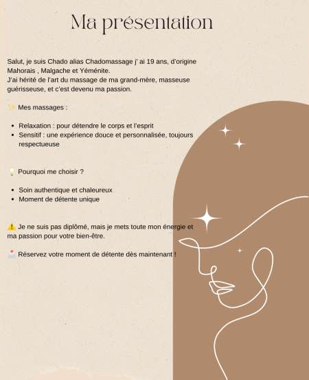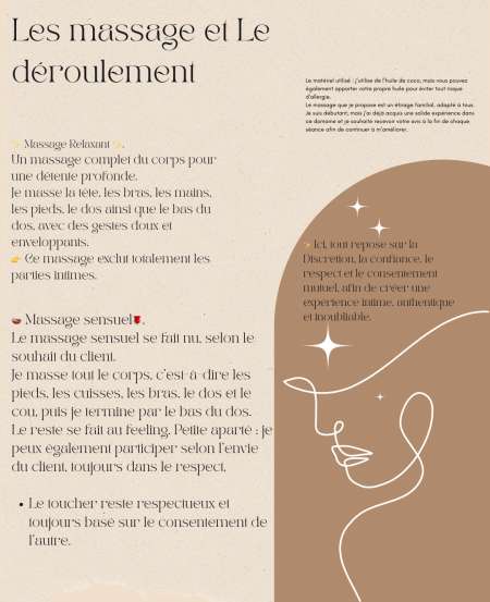 Profitez d'un massage complet et naturel, directement chez vous, pour découvrir une autre façon de prendre soin de votre corps. A l'huile de coco pure, mes gestes fluides et progressifs vous accompagnent vers une relaxation profonde et... peut-être plus, selon vos envies et votre curiosité.